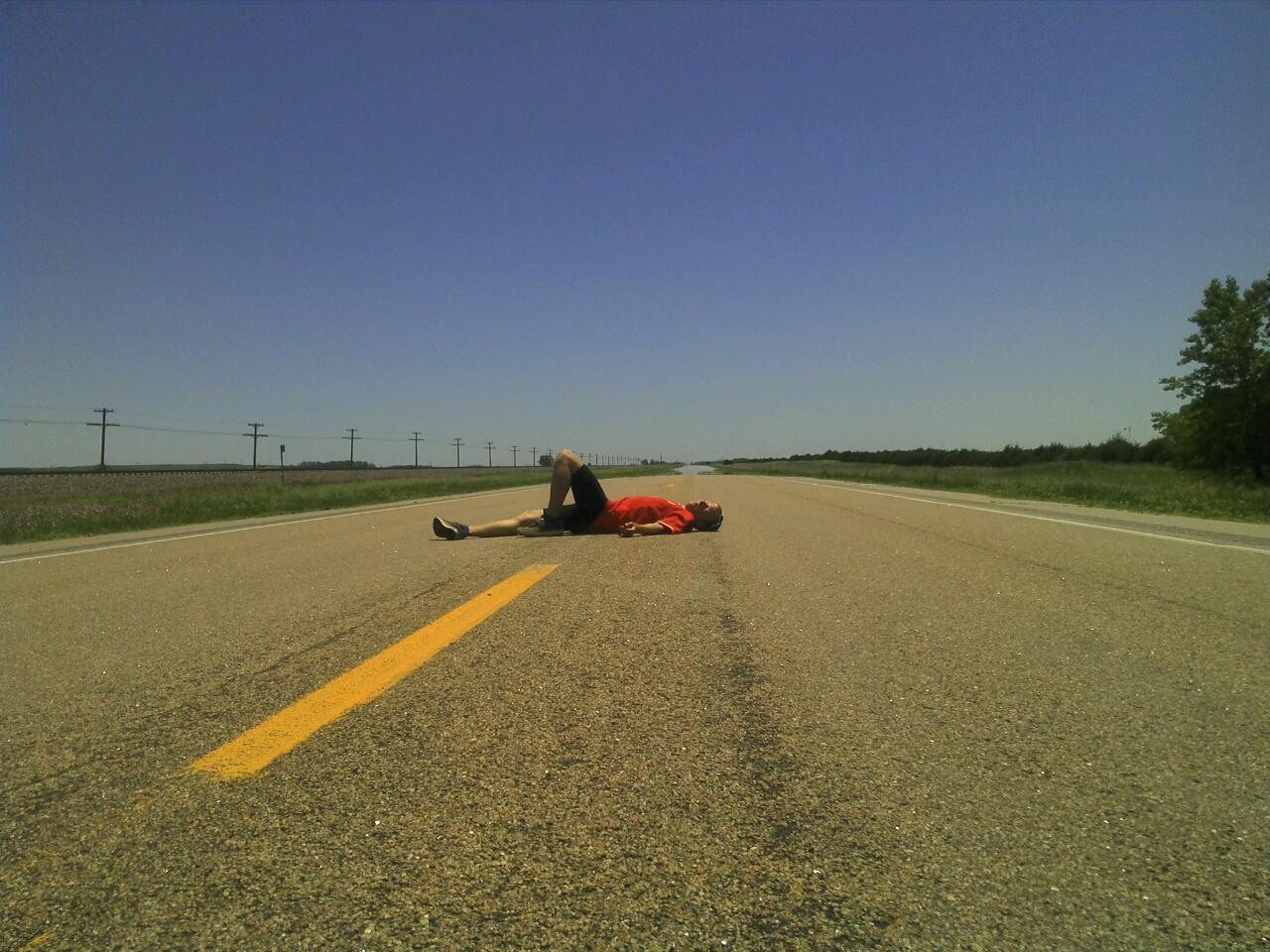 After about 4 miles I reached the roadworks, the entire width of the road had collapsed into a drainage channel. I approached three construction workers and pleaded my case. After about 3 seconds of silence, and me trying to work out whether their stoic faces were really ones of disapproval or bemusement one of the workers agreed to guide me through and added 'it wasn't me, remember..' What followed should have been carried out on a mountain bike, a steep drop off into a railway ditch with gravel and sand, he was only doing about 15 mph but I was clinging onfor dear life. I weaved around some pipes, cables and other obstacles before just about making it to the otherside. The highway was completely clear for the next 6 miles and I took the opportunity for a mid highway photo, although concious that trucks might appear (an unloaded gun is the most dangerous gun.. blah blah..)